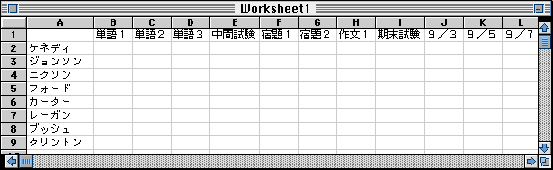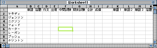 このようにして準備したシートに数字を入れていくわけですが、このやり方だといくつか問題があることに気づくと思います。教師が一番見たいテストの平均点や出欠席の合計などの中間集計結果やそれらをさらに集計して最終的な計算結果を入れる列がシートの右端にいってしまい、いちいちスクロールしなくてはならず不便です。これを解決するために、まず、集計結果を入れる列を名前のすぐ隣に作って、その後に個々のテストの点数や出欠席の記録を入れる列を作ります。(図3参照) このようにして準備したシートに数字を入れていくわけですが、このやり方だといくつか問題があることに気づくと思います。教師が一番見たいテストの平均点や出欠席の合計などの中間集計結果やそれらをさらに集計して最終的な計算結果を入れる列がシートの右端にいってしまい、いちいちスクロールしなくてはならず不便です。これを解決するために、まず、集計結果を入れる列を名前のすぐ隣に作って、その後に個々のテストの点数や出欠席の記録を入れる列を作ります。(図3参照)